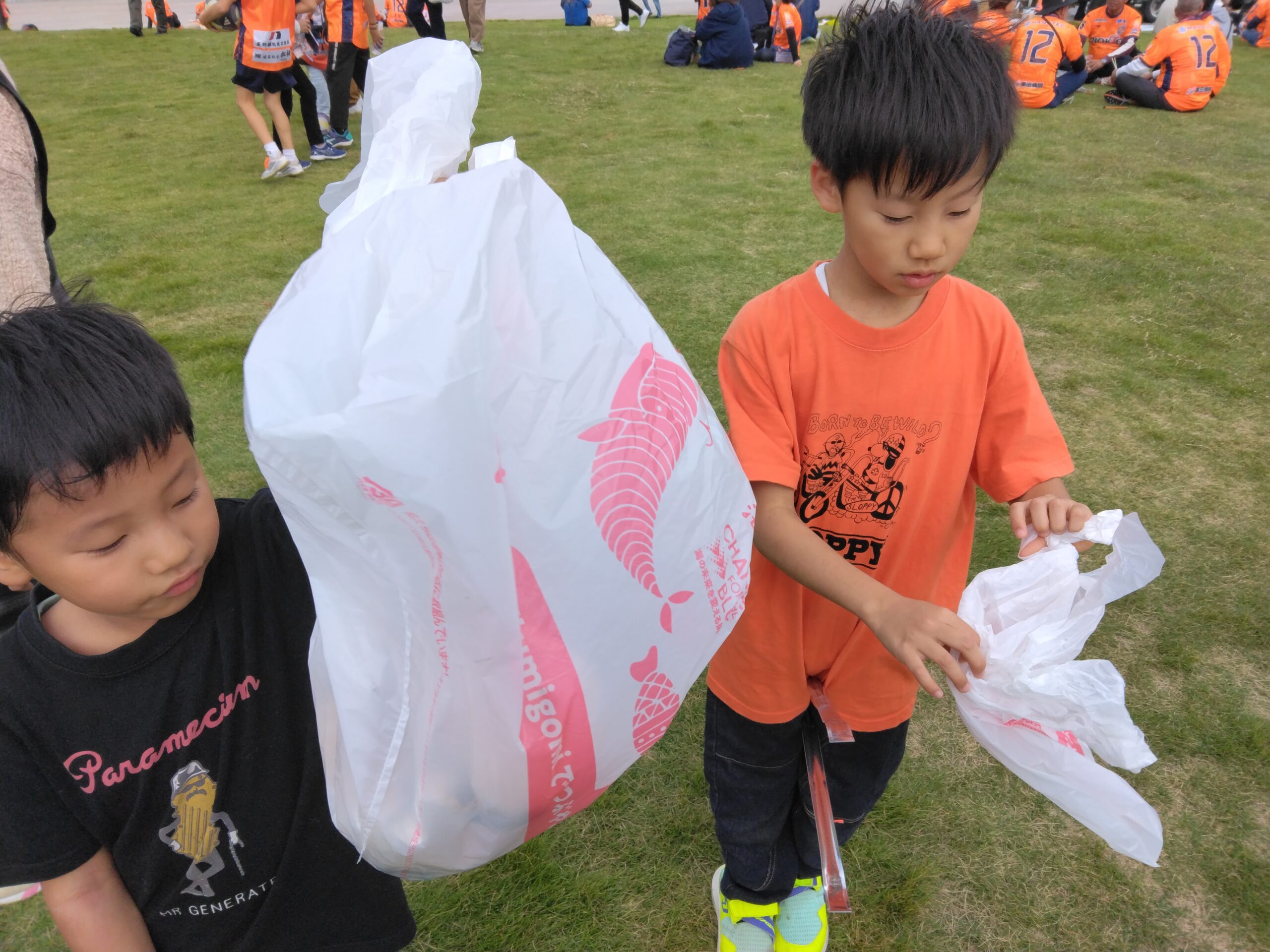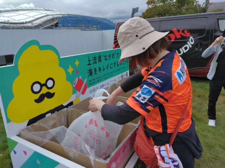 海と日本プロジェクト㏌長野も連携し、集まったサポーターにスタジアムやその周辺のごみ拾いを呼びかけました。一見、きれいに見えるスタジアムですが、植え込みの中や道路沿いにはポリ袋、小さな包み紙、ペットボトルなどが落ちていました。参加者は集めたごみを、うんこ先生の「拾い箱」に入れ、分別も体験しまいした。