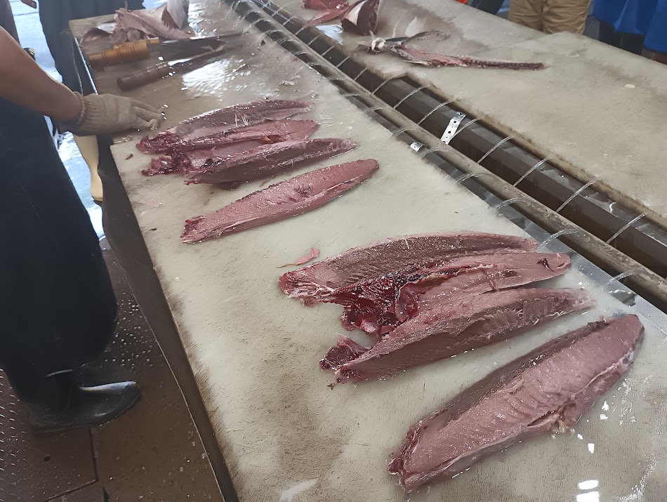 まず「生切り」。カツオの頭を切り落とし、内臓を取り除き、3枚におろします。職人さんが手際よくさばいていました。