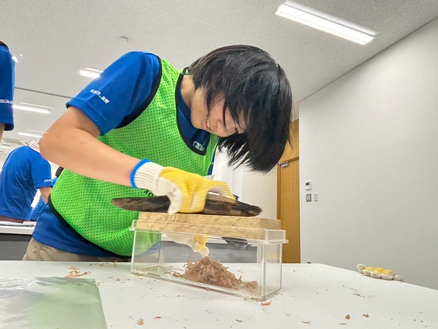 もちろん、隊員のみんなも初挑戦。刃の当て方によって、厚さが変わります。うまく削れず、苦戦する子も。「世界で一番硬い食べ物」と言われる硬さを実感しました。