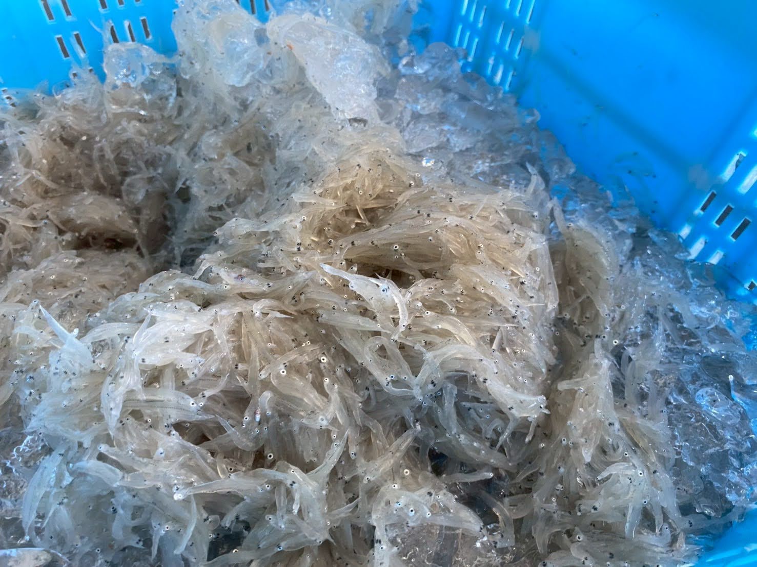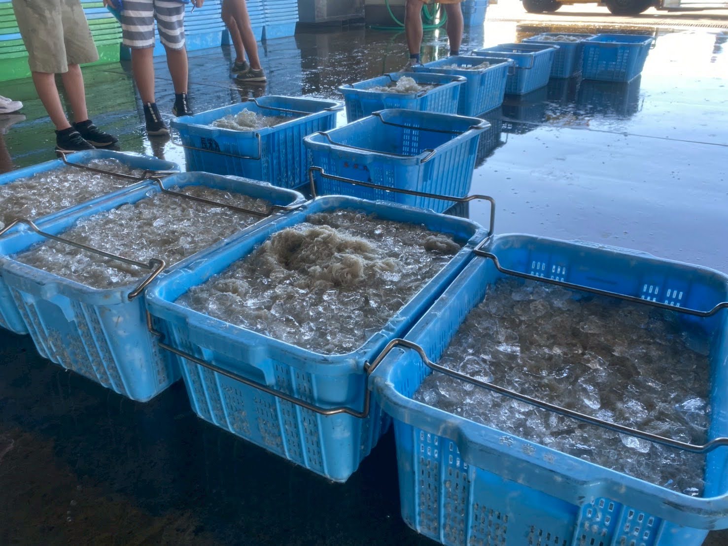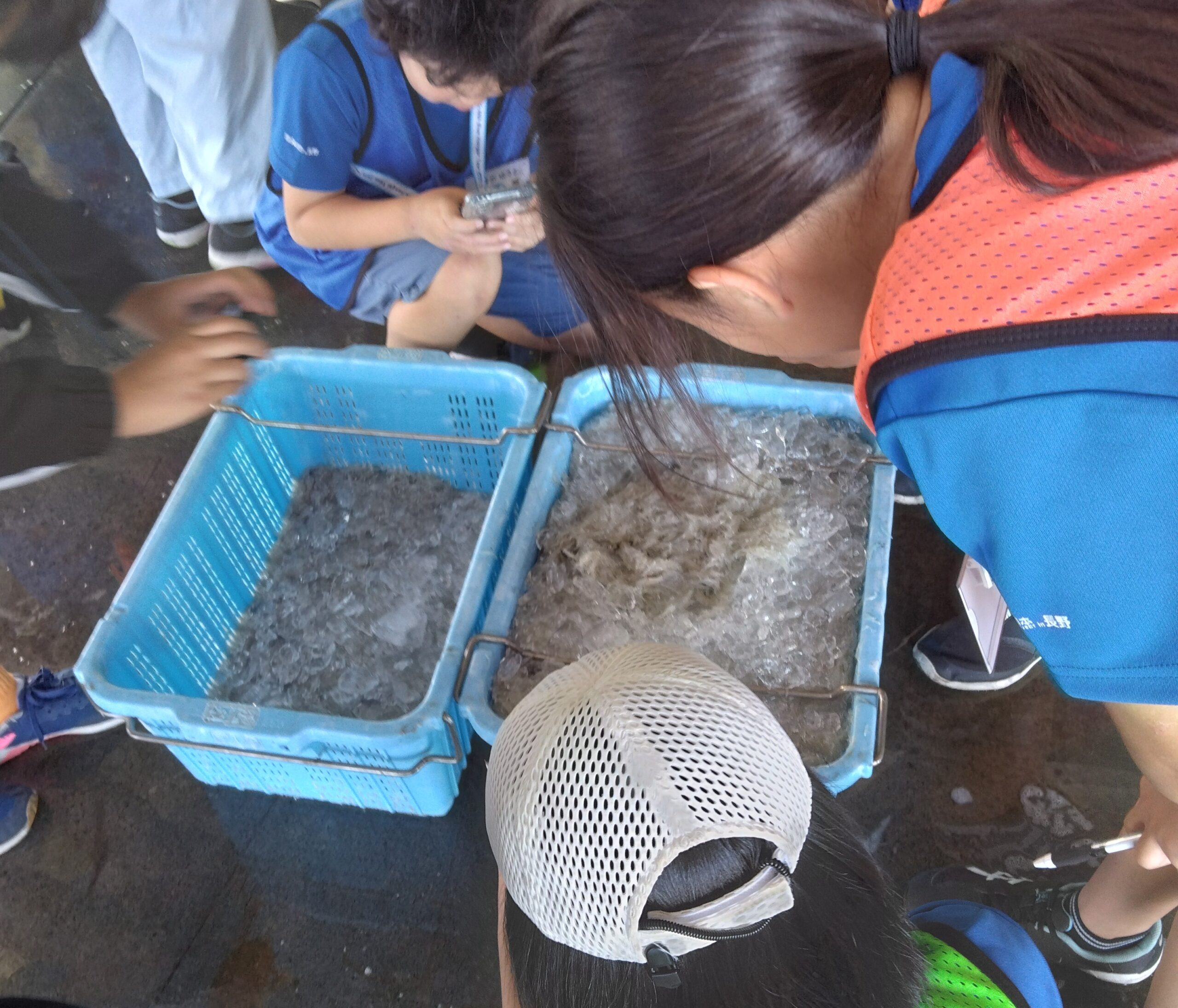 大量の氷で冷やされて運ばれてきたシラス。主にカタクチイワシの稚魚のことで、生で食べられますが、釜揚げやしらす干しなどにも加工されます。隊員たちも興味津々の様子。