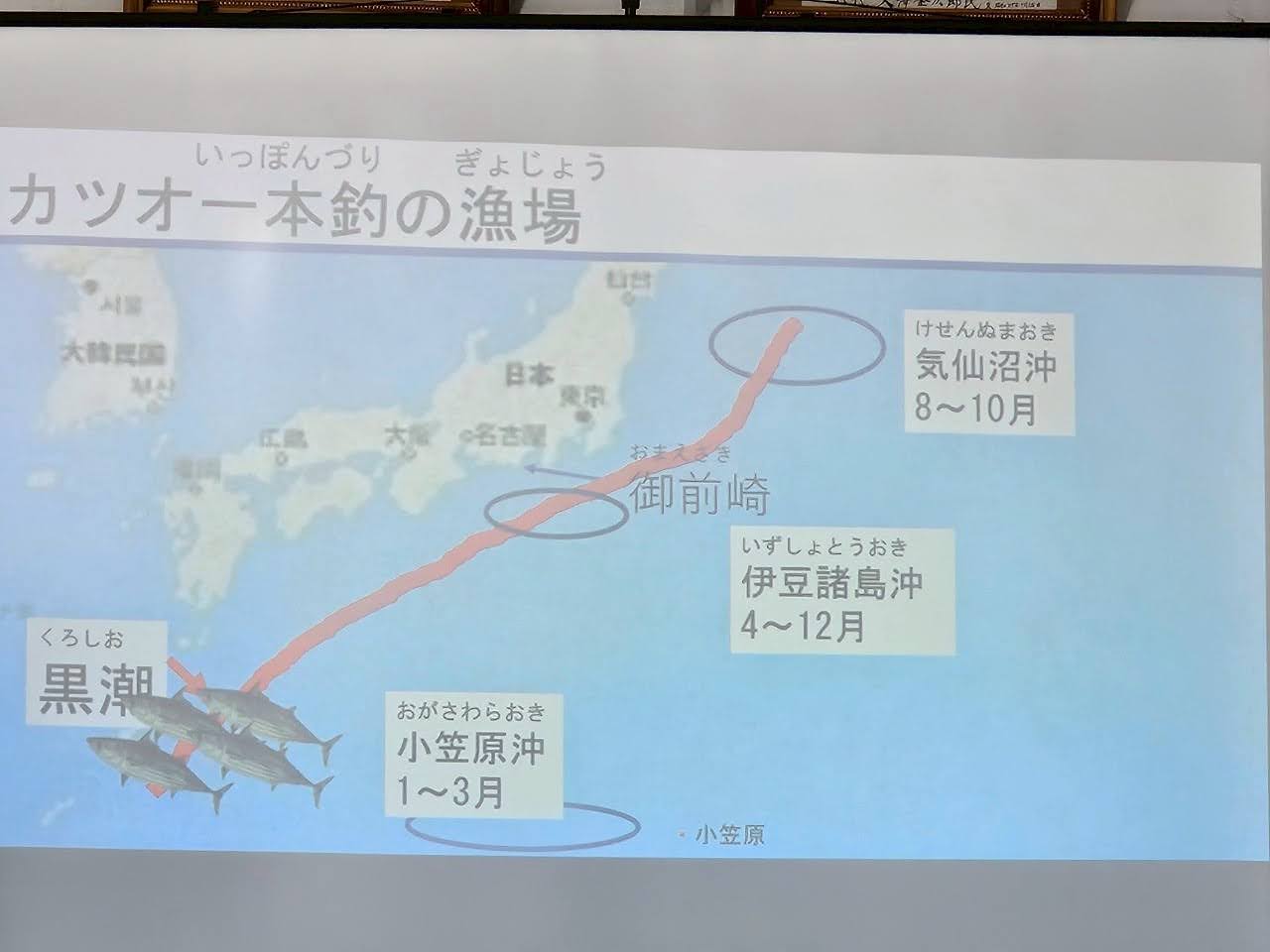 御前崎港は、カツオの「漁場」が近く、一本釣り漁が盛ん。実際に一本釣りをしているビデオを鑑賞しながら、御前崎港は生カツオの漁獲が静岡県内の7割を占めていることなどを教わりました。