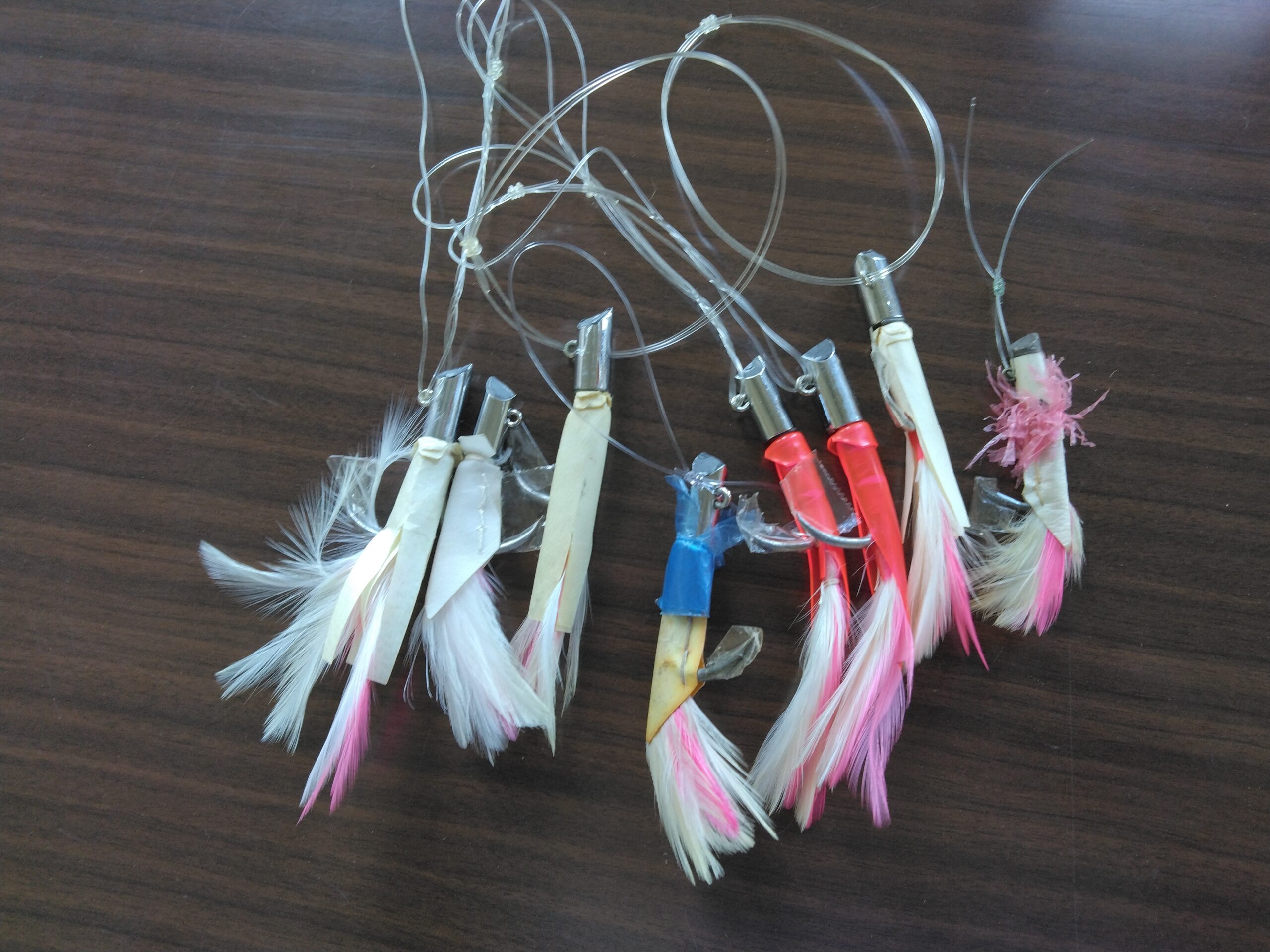 そのあと、隊員たちに渡されたのは一本釣りで使われる疑似餌「バケ」です。鳥の羽やビニールひもが巻かれていて、鋭い針がついています。
