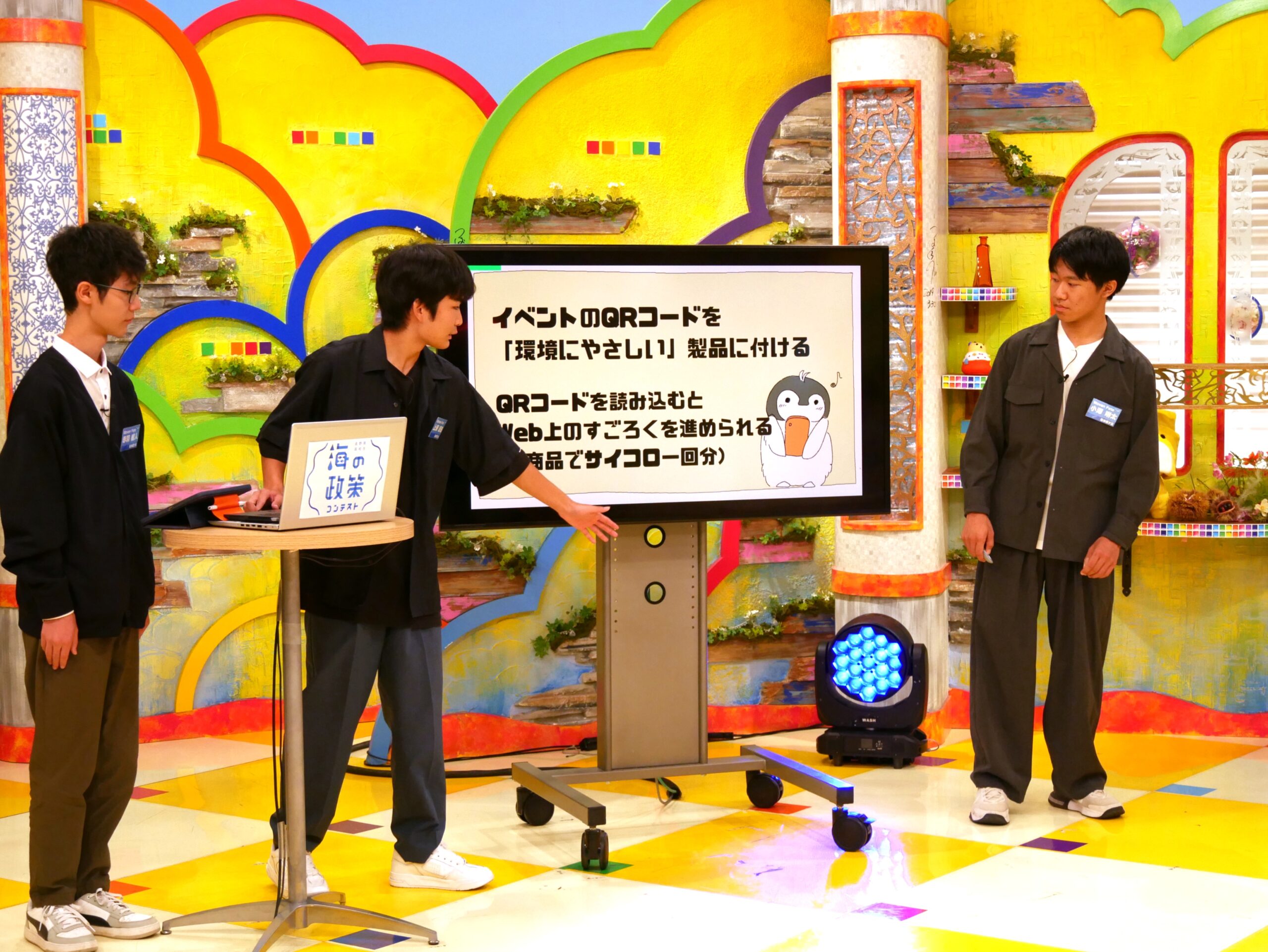 松本県ヶ丘高校「WOVEN FATE」は、海洋ごみ削減に向けて、環境に優しいプラスチック代替素材の普及を促す取り組み「ウミ×トク革命」を提案。環境に配慮した商品を買ってもらい、スマホで「すごろく」を楽しみながら、特典を獲得できる仕組みを考えました。