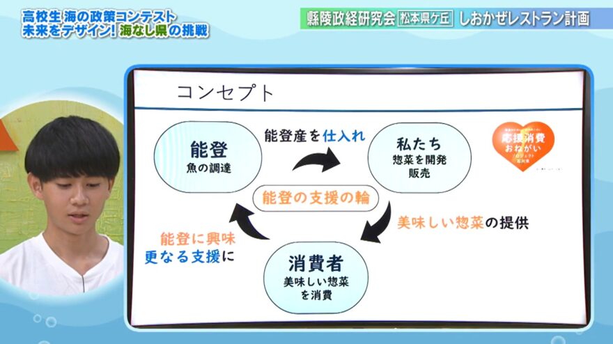 トップバッターは松本県ヶ丘高校「縣陵政経研究会」。政治・経済に関心を持つメンバー3人で結成され、「仲間と共に課題解決に取り組みたい」という思いからコンテストに参加しました。