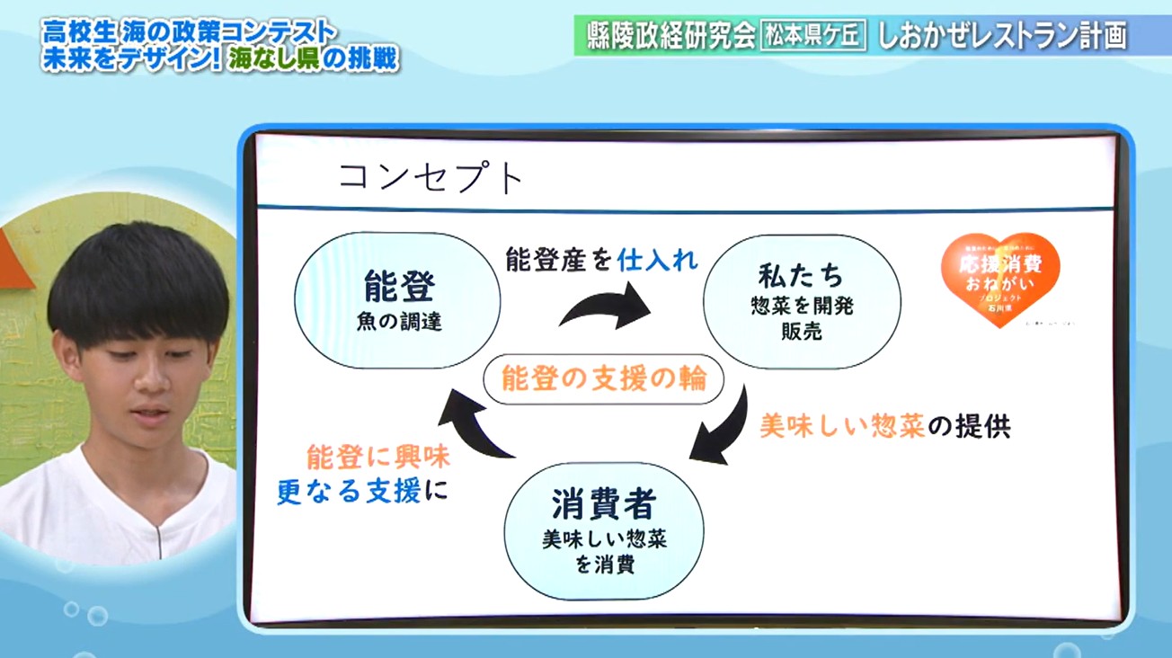 この日、3人が提案したのは、能登半島地震の復興支援を目的とした「能登ブリかがやきバーガー」の販売です。事前合宿で能登を訪れた3人。地震の爪痕を目の当たりにし、漁師や地域振興に取り組む人たちと交流する中で知った人口減少などの課題も知りました。これらを受けて、能登の支援、漁業振興につながる政策・提案を模索し、辿り着いたのが海産物で信州と能登をつなぐアイデアでした。