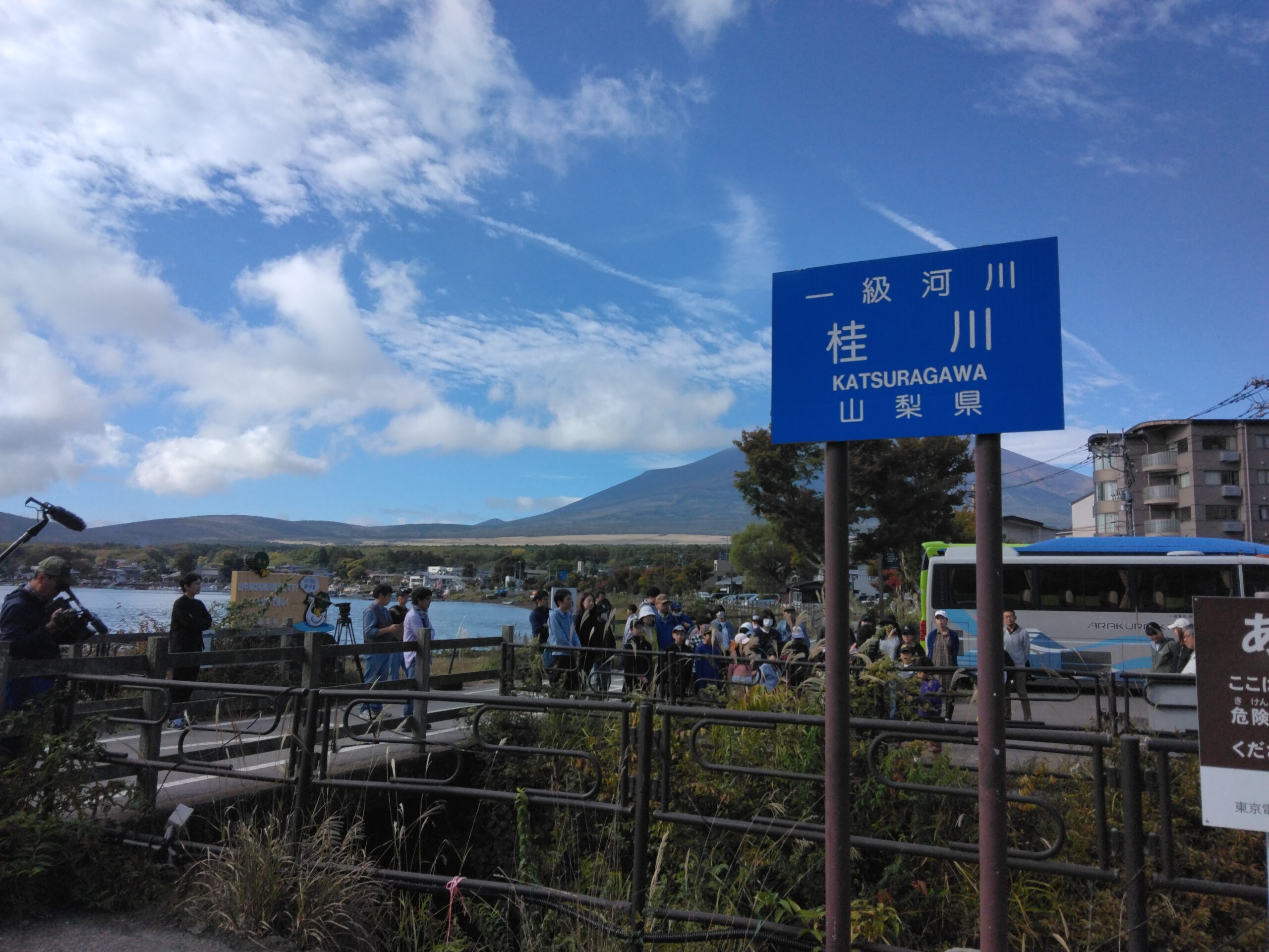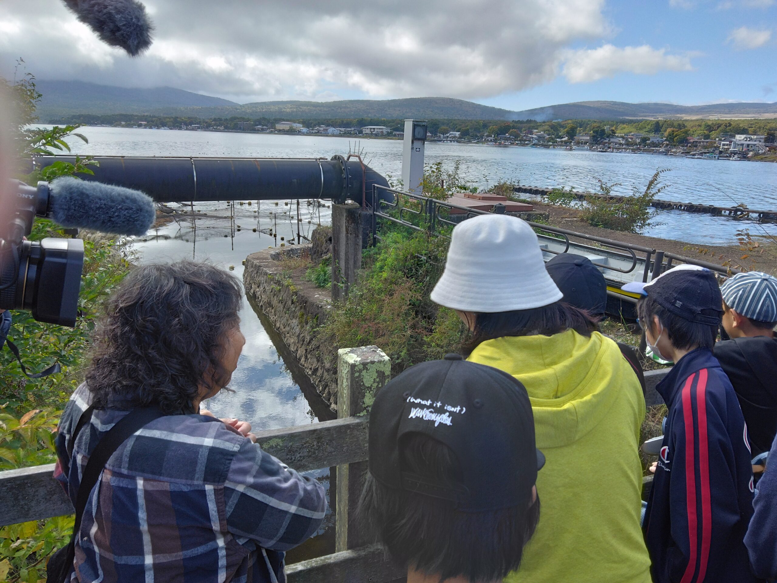 10月、一行は山梨県の山中湖へ。こちらが桂川・相模川の源流です。現地の児童とも合流し、学習スタート。
