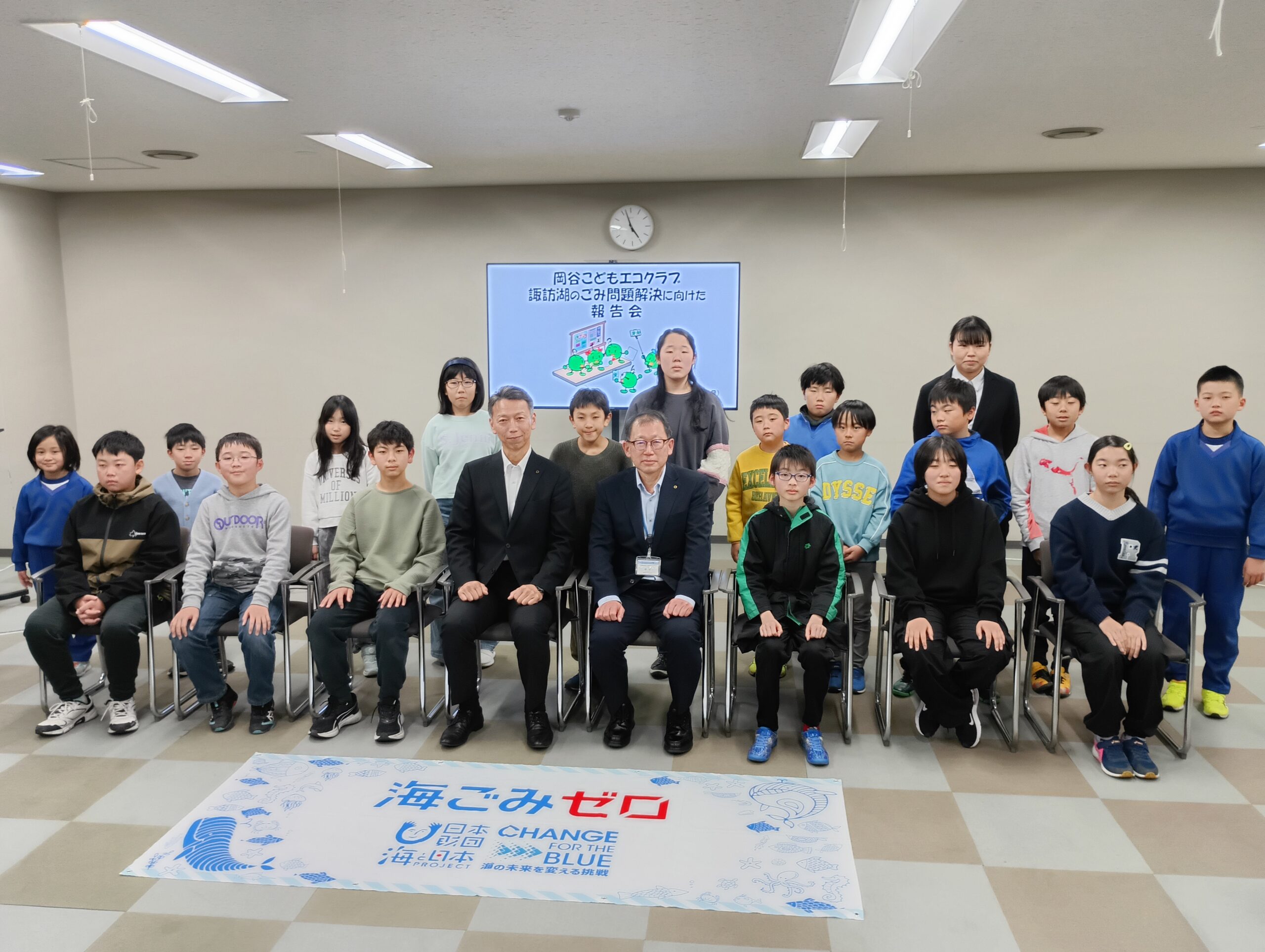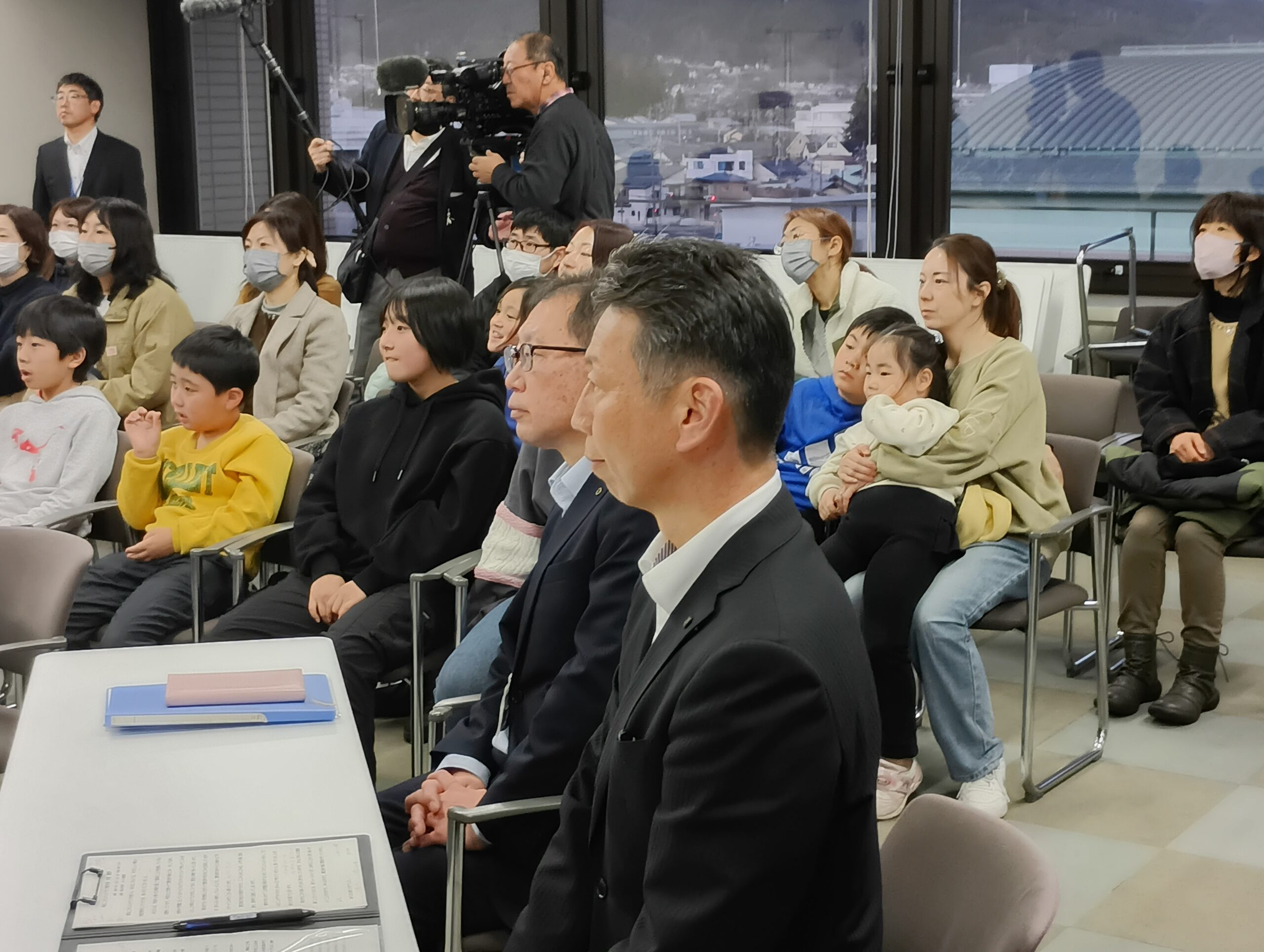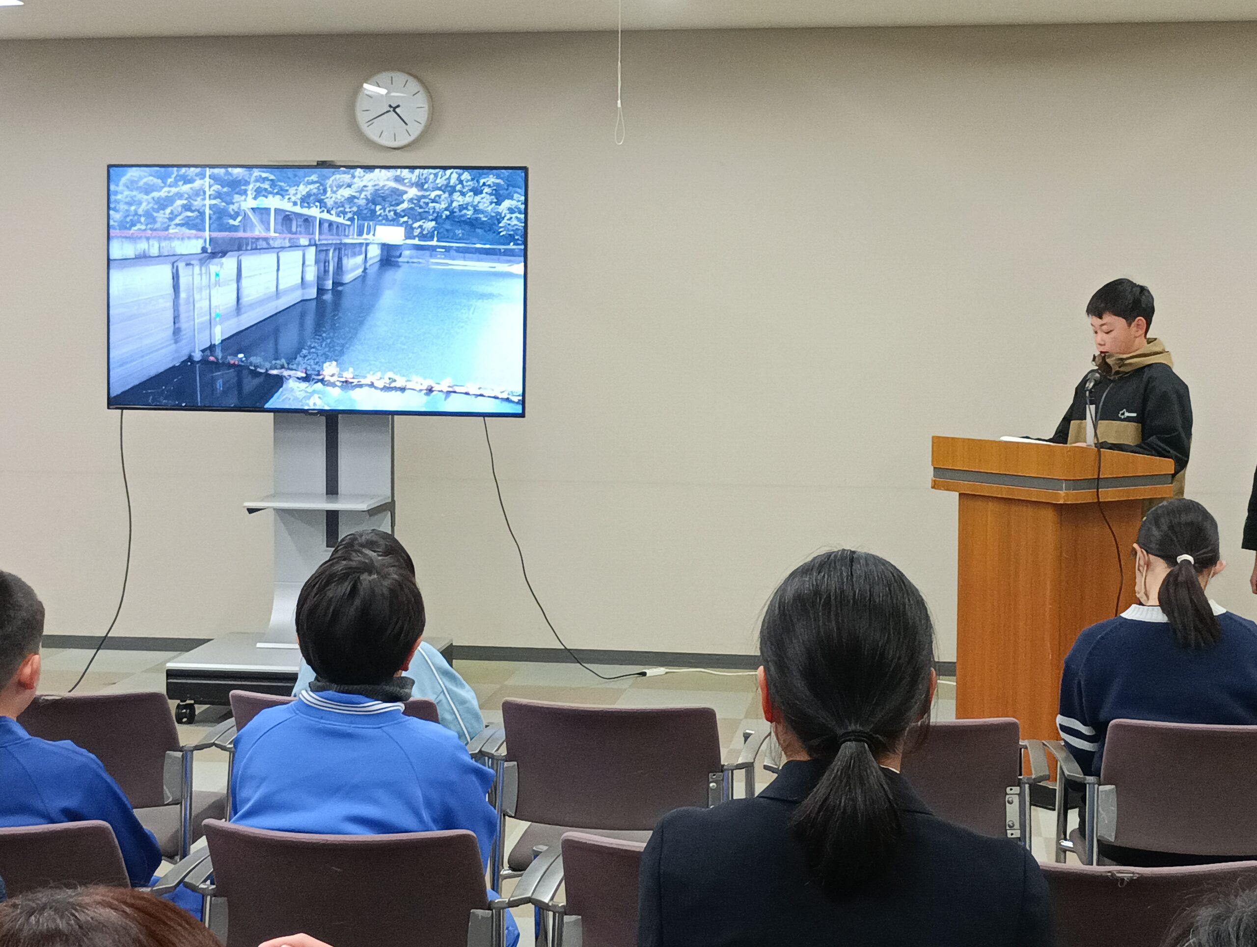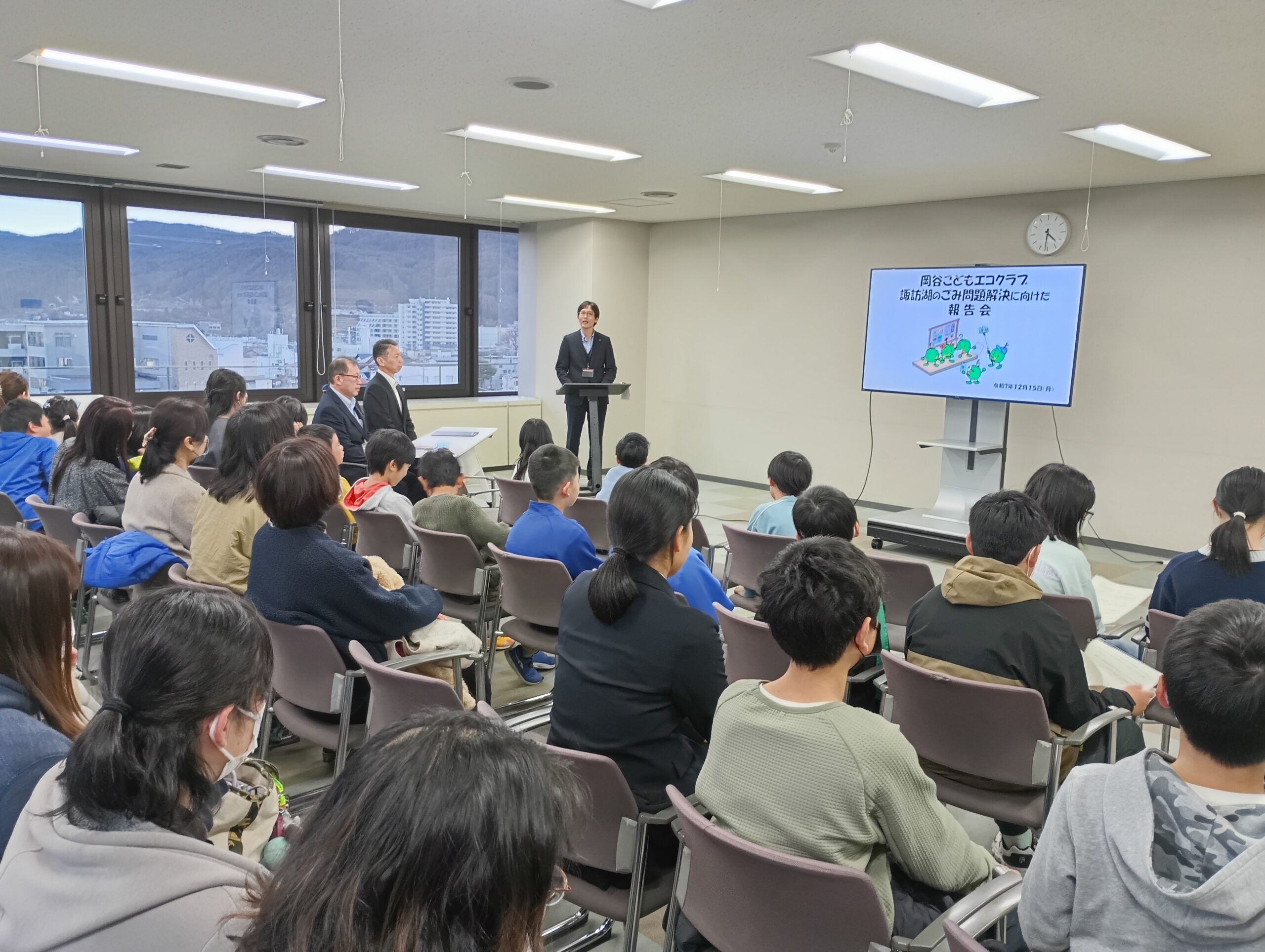 岡谷市の早出一真市長を迎えて開催された報告会。子どもたちは、今年度に学んだこと・考えたことを発表しました。