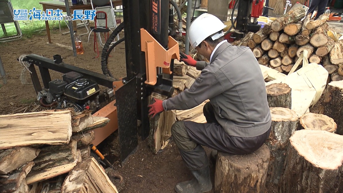 ここは長野市七二会地区。森林クラブのメンバーが、地域で伐採したコナラの木を使って、薪作りを行っています。視察するのは静岡県焼津市で鰹節生産を行う会社などで作る「焼津鰹節水産加工業協同組合」です。