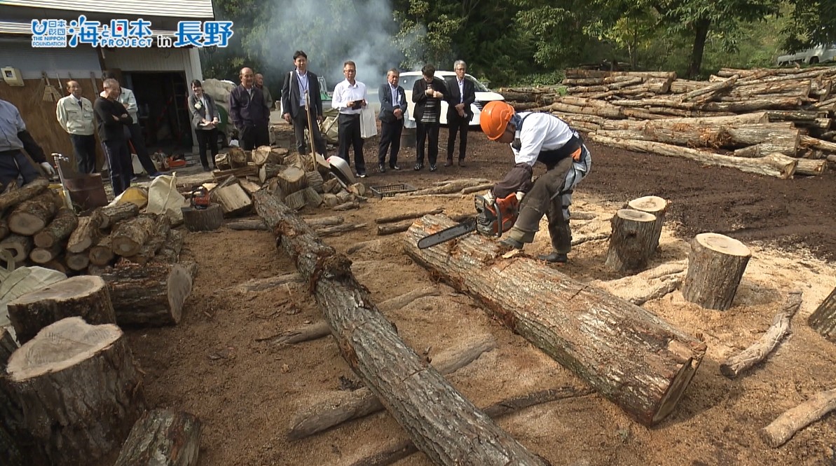 ここは長野市七二会地区。森林クラブのメンバーが、地域で伐採したコナラの木を使って、薪作りを行っています。視察するのは静岡県焼津市で鰹節生産を行う会社などで作る「焼津鰹節水産加工業協同組合」です。